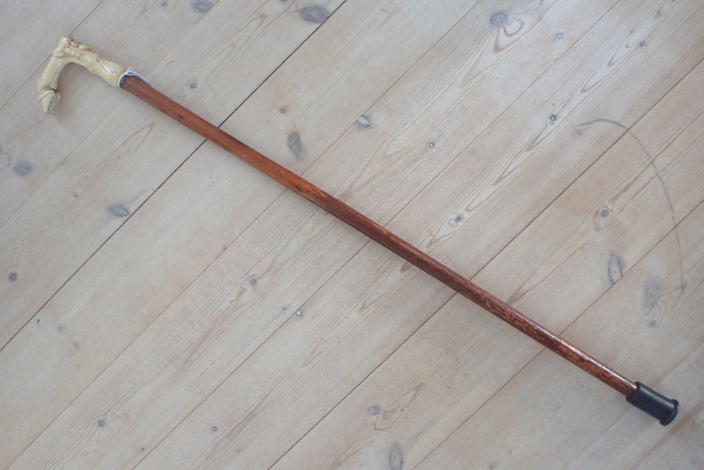 Stok med greb af udskåret elfenben i form af et hesteben sat med metal på en malakkastok med dupsko af gummi. Engelsk? ca. 1880. Længde. 82,7 cm. Sælges med Cites-certifikat. Pæn med tidstypisk slid.