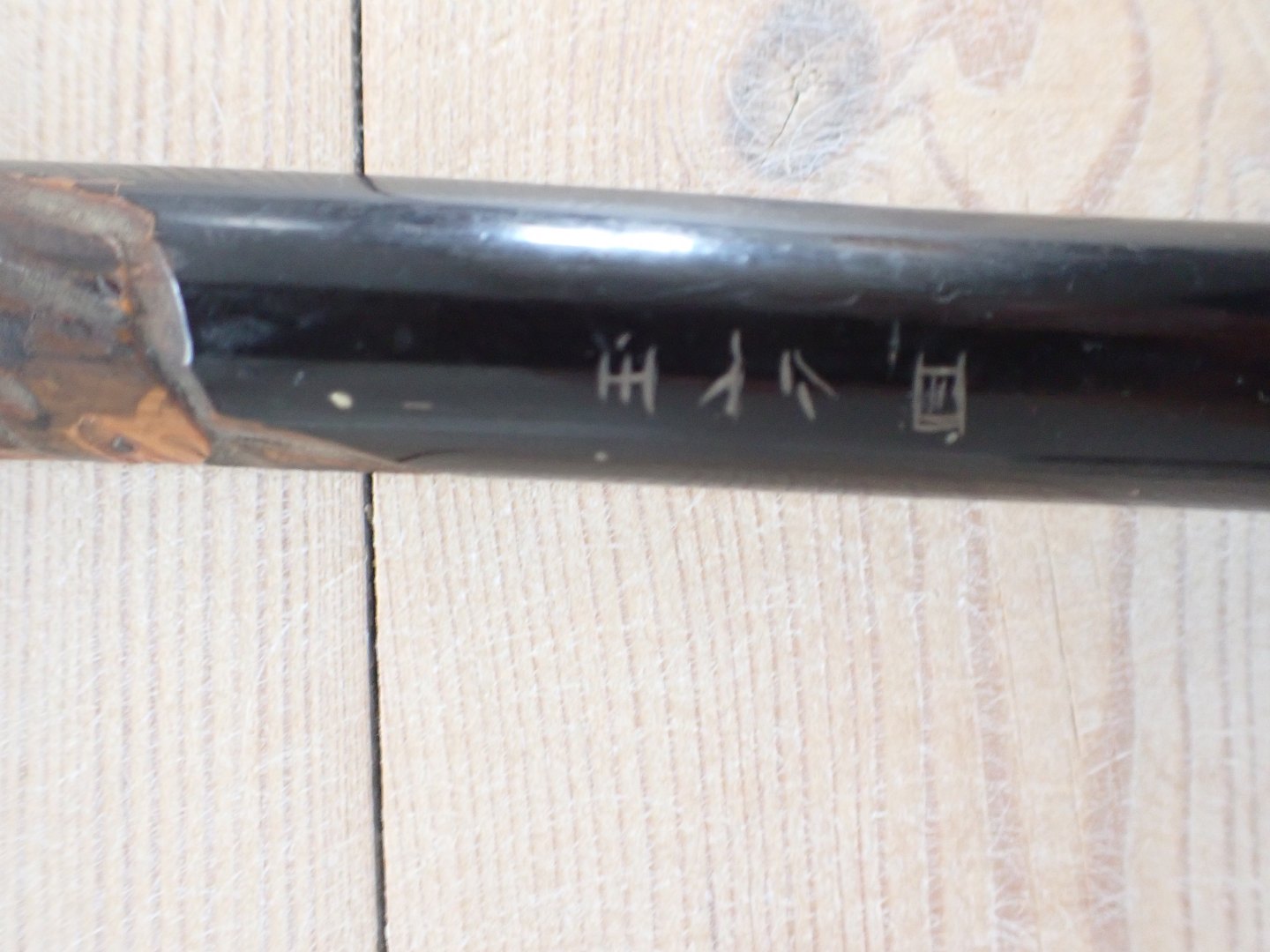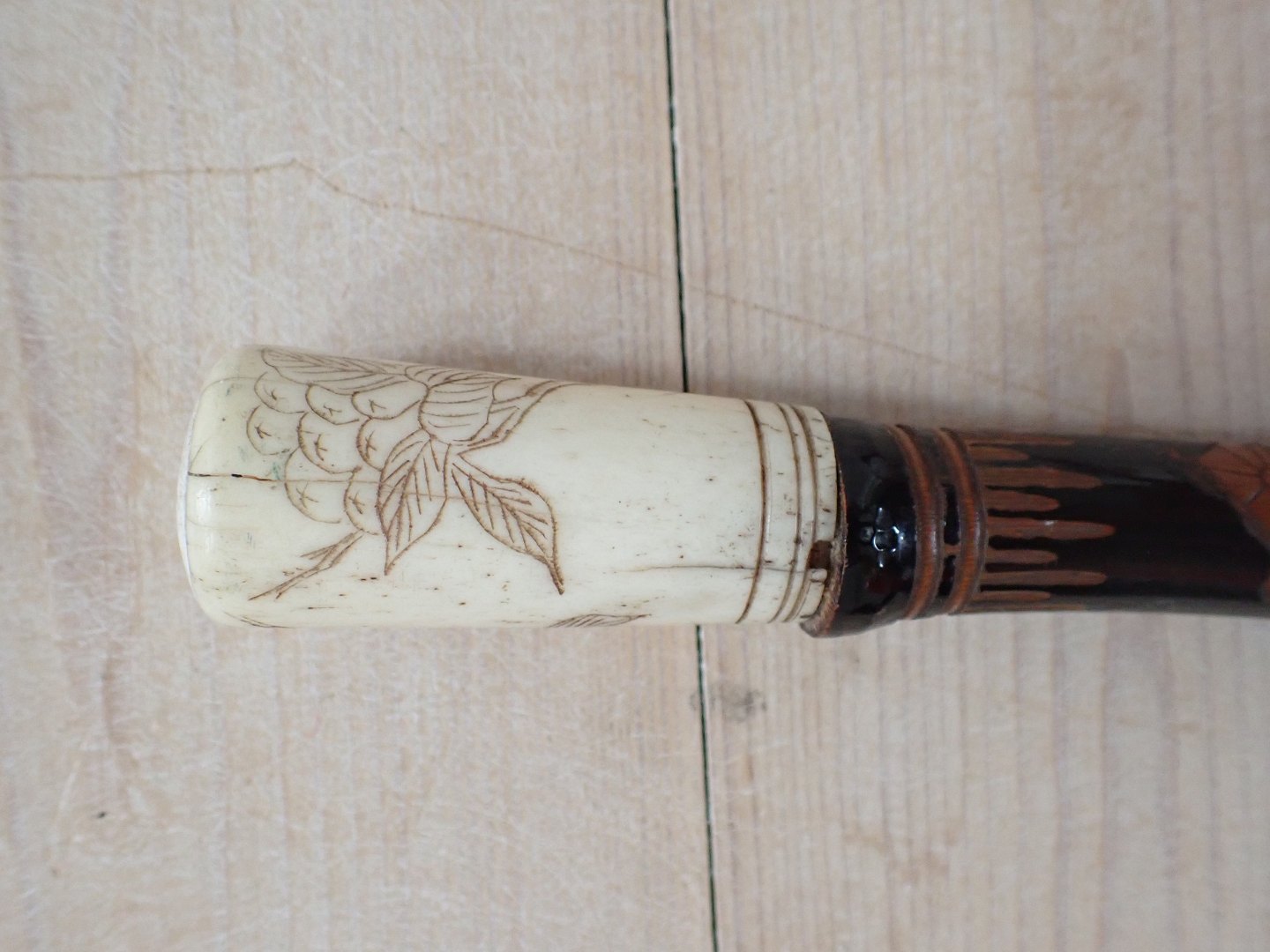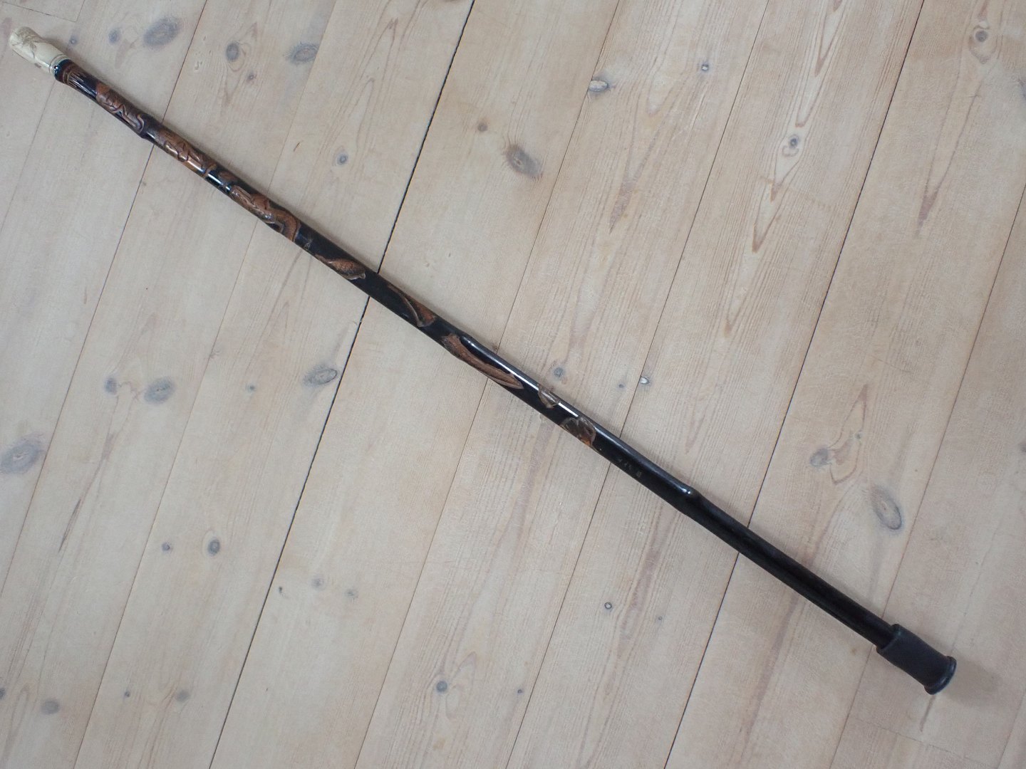 Japansk stok med knop i malet, udskåret bambus, med blomsterdekoreret knop af ben og med nyere dupsko af gummi. Udskæringerne på stokken fore stiller aber, en fisk og en snoende drage. Ca. 1920. Længde: 90,5 cm. I pæn stand o forhold til alder med let slid.