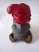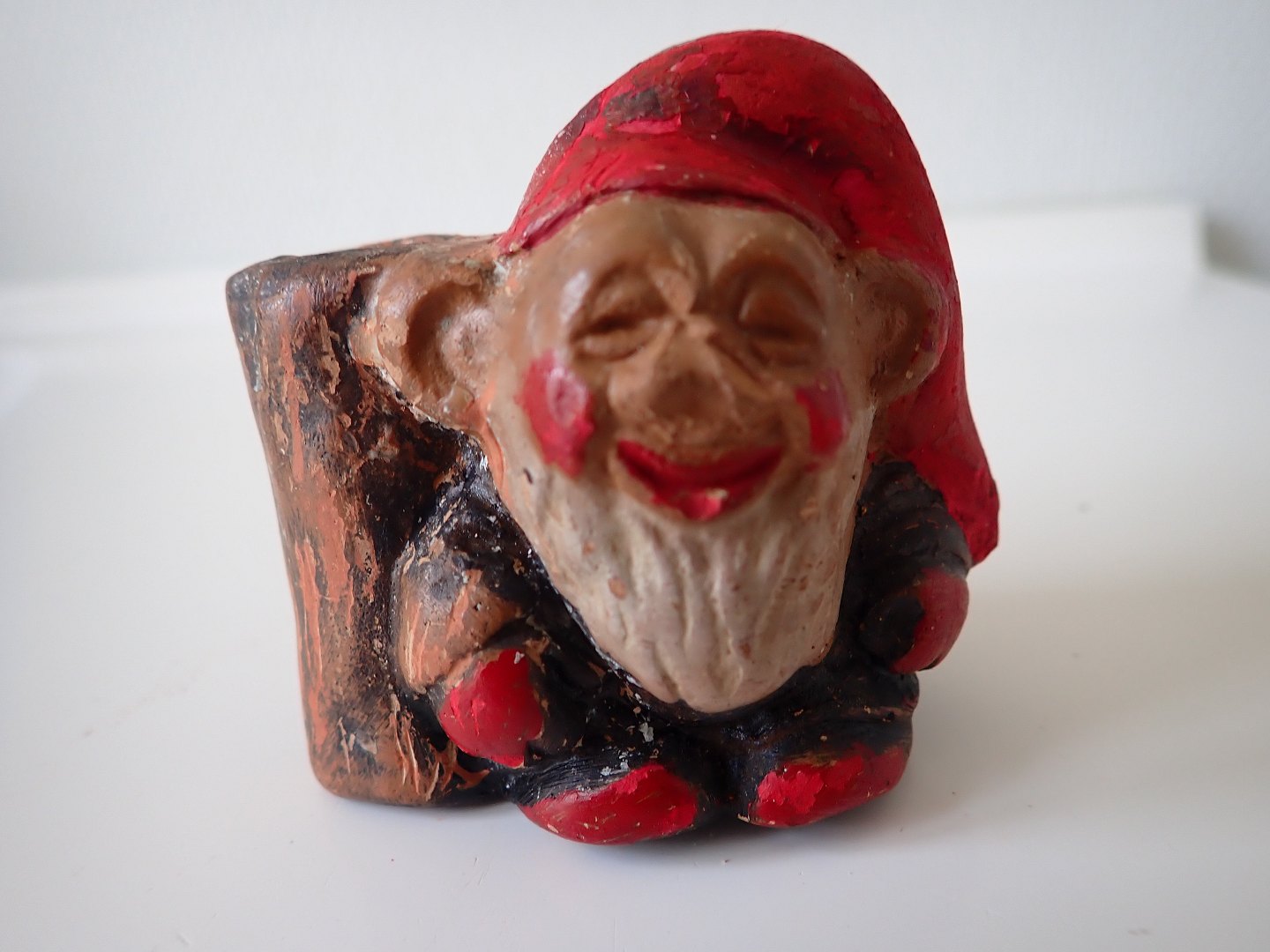 Til venstre: siddende nisse med lysholder. Højde: 13 cm. bredde: 13,5 cm. I pæn stand med lidt afslag. Solgt.