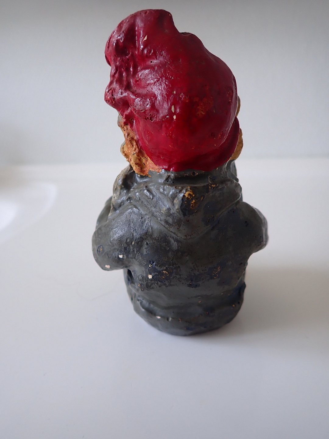 Forest i midten: Lille nisse med lysholder. Højde: 5,5 cm. I lidt slidt sand med lidt flad næse. Pris: 150 kr.