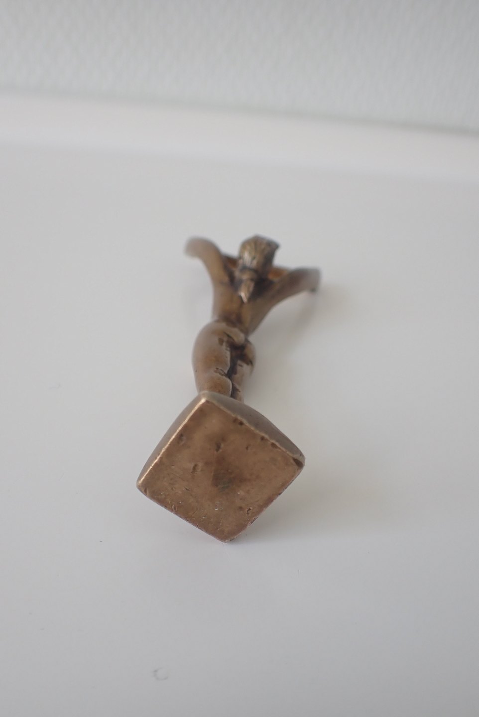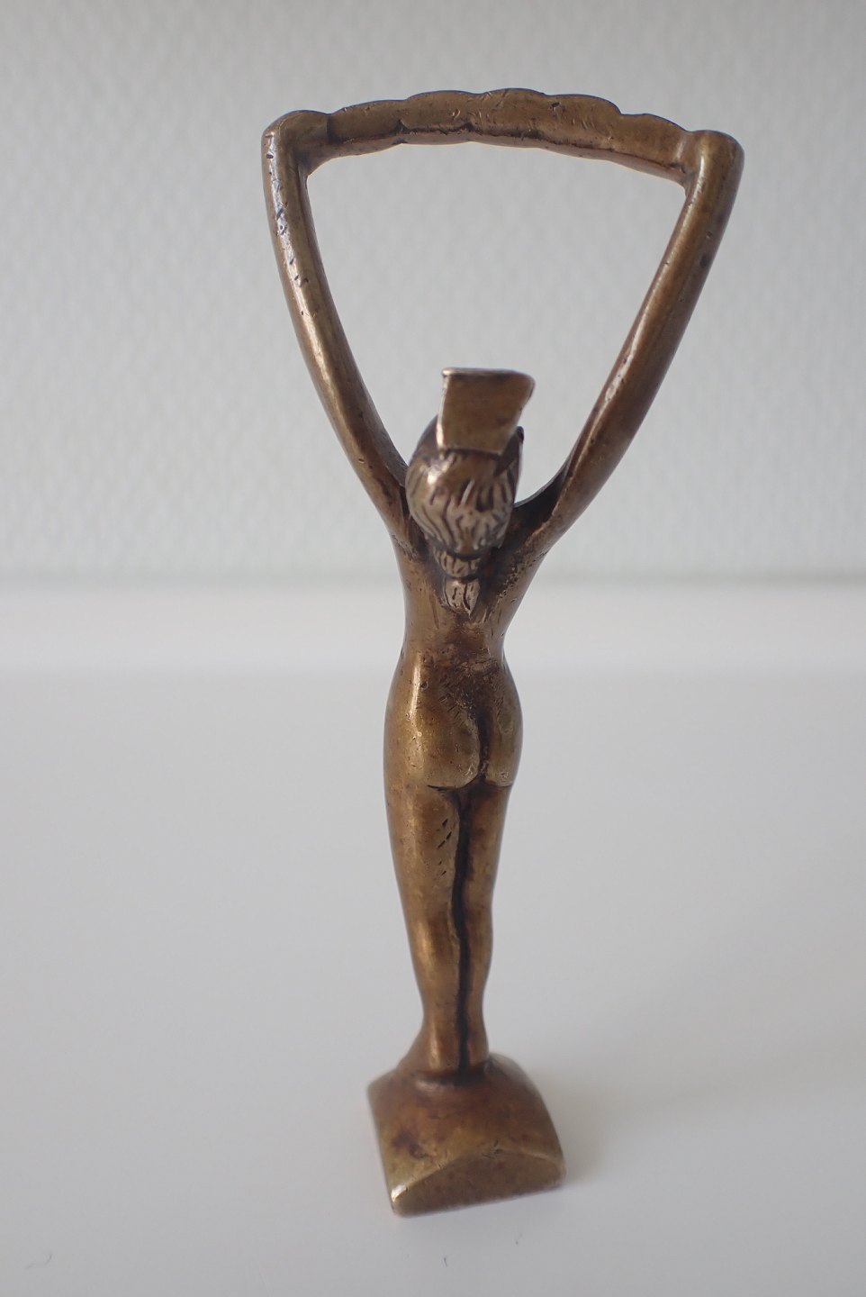 Bronzeoplukker i form af en nøgen kvinde. Dansk ca.1930. Højde: 9,7 cm. Vægt: 75,2 gram. I pæn tidstypisk stand.