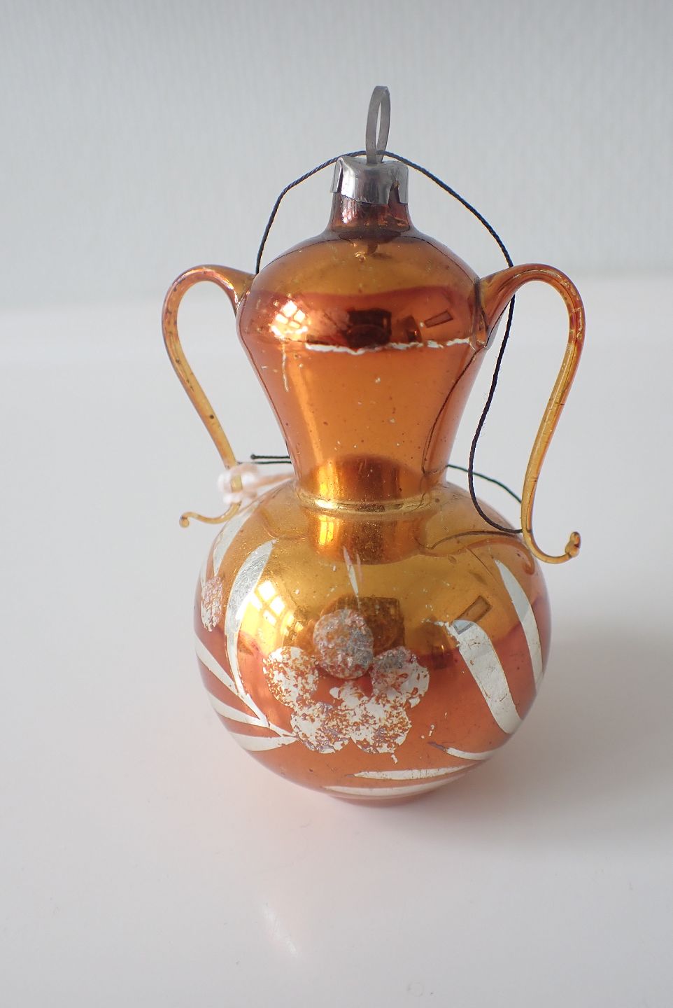 1 Stk. glasjulepynt - 2 hanket lågvase i guldbronze med sølvdekoration. Med ophæng og kan stå. Stammer fra Leipzig tidlig 1900-tal. Højde: 7,2 cm. Bredeste diameter: 4,3 cm. I fin stand.