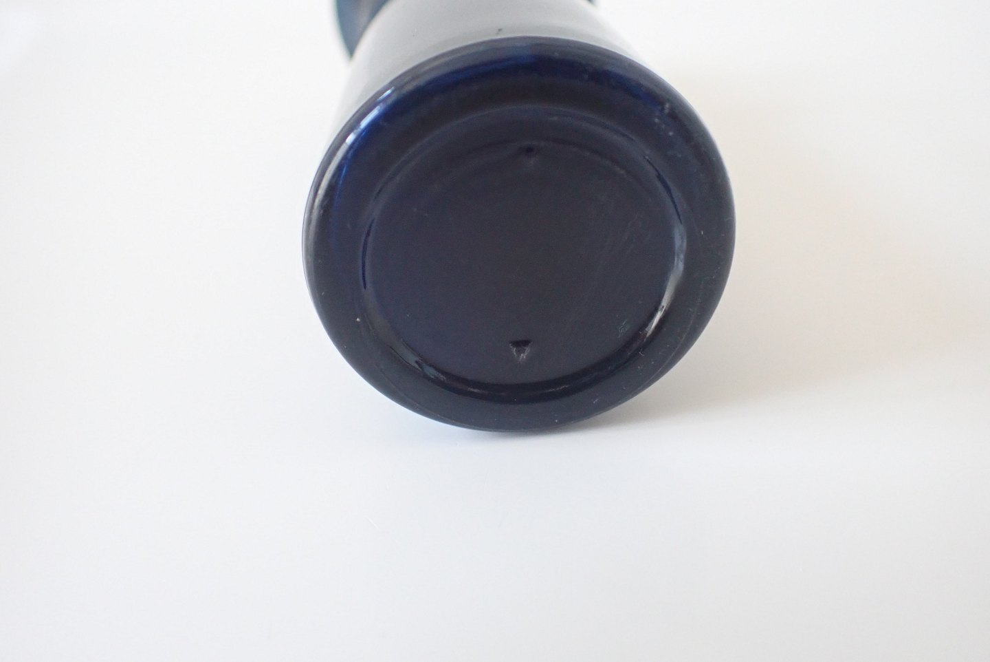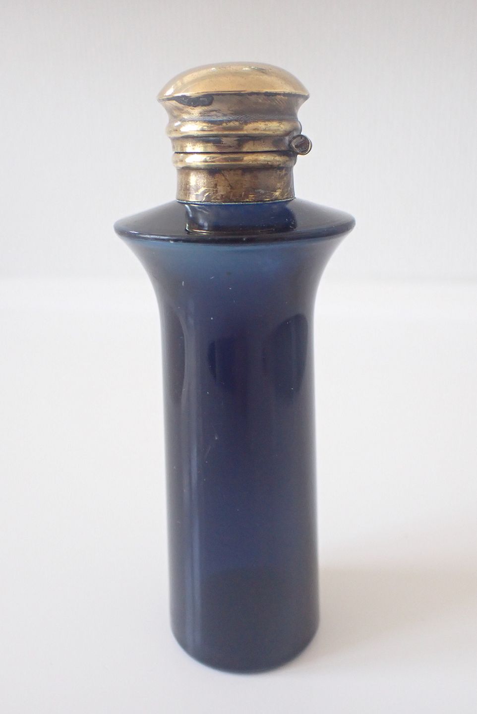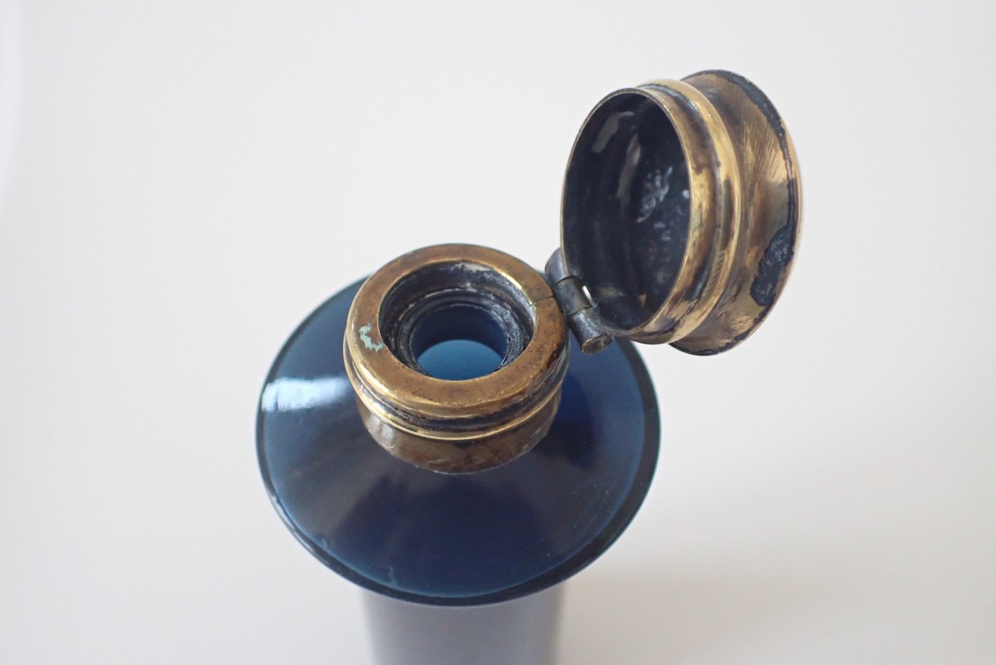 Parfumeflaske i blåt glas med messinglåg, engelsk ca. 1900. Højde:11,5 cm. I fin stand men mangler indre glasprop.