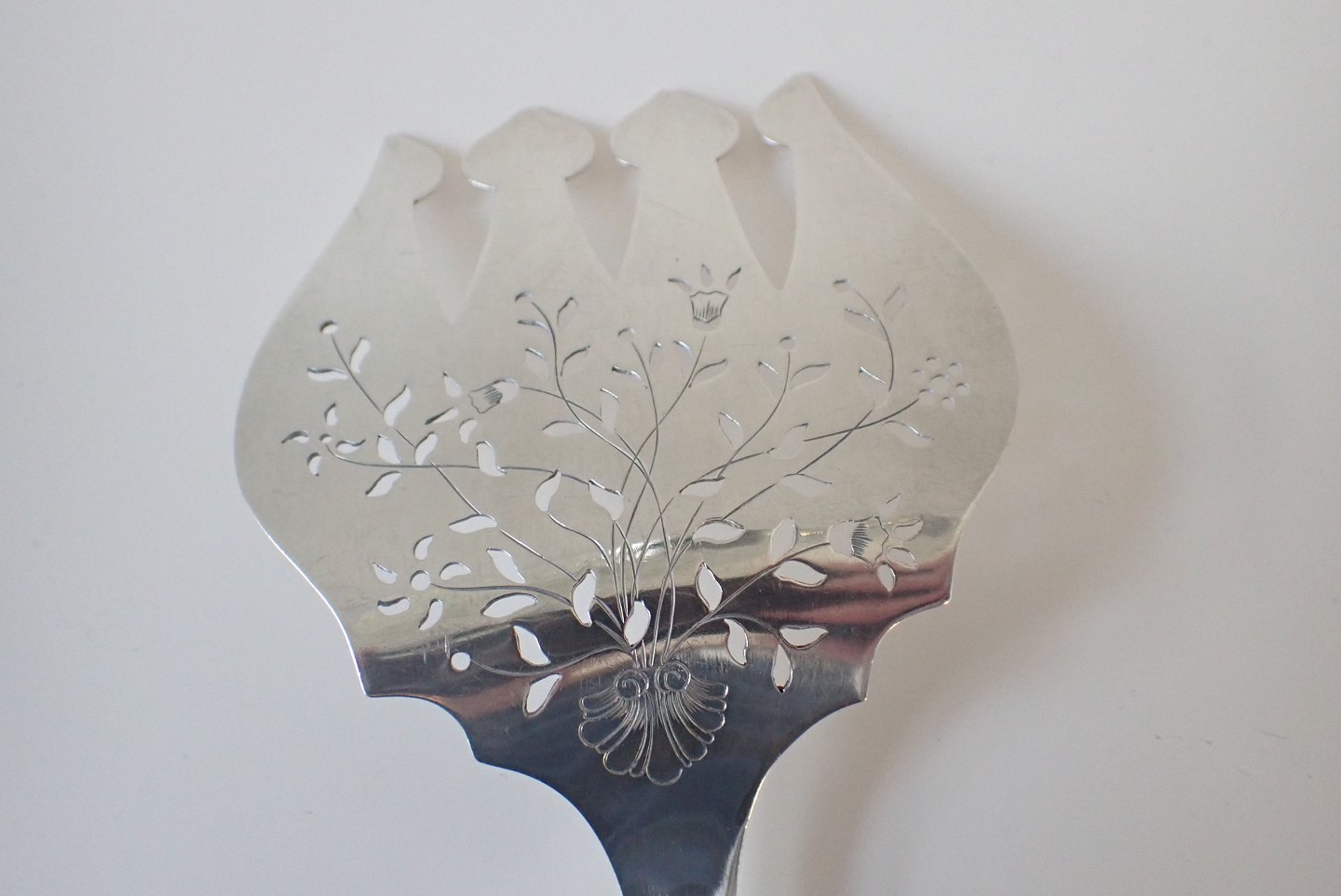 Holger Kyster (1898 - 1944) - fiskespade i 825 sølv med perforeret og påsat blomstermotiv. Stemplet Holger Kyster og 2 gange fuglen fra Kolding byvåben. Vægt 106 gram. Længde: 23,2 cm.