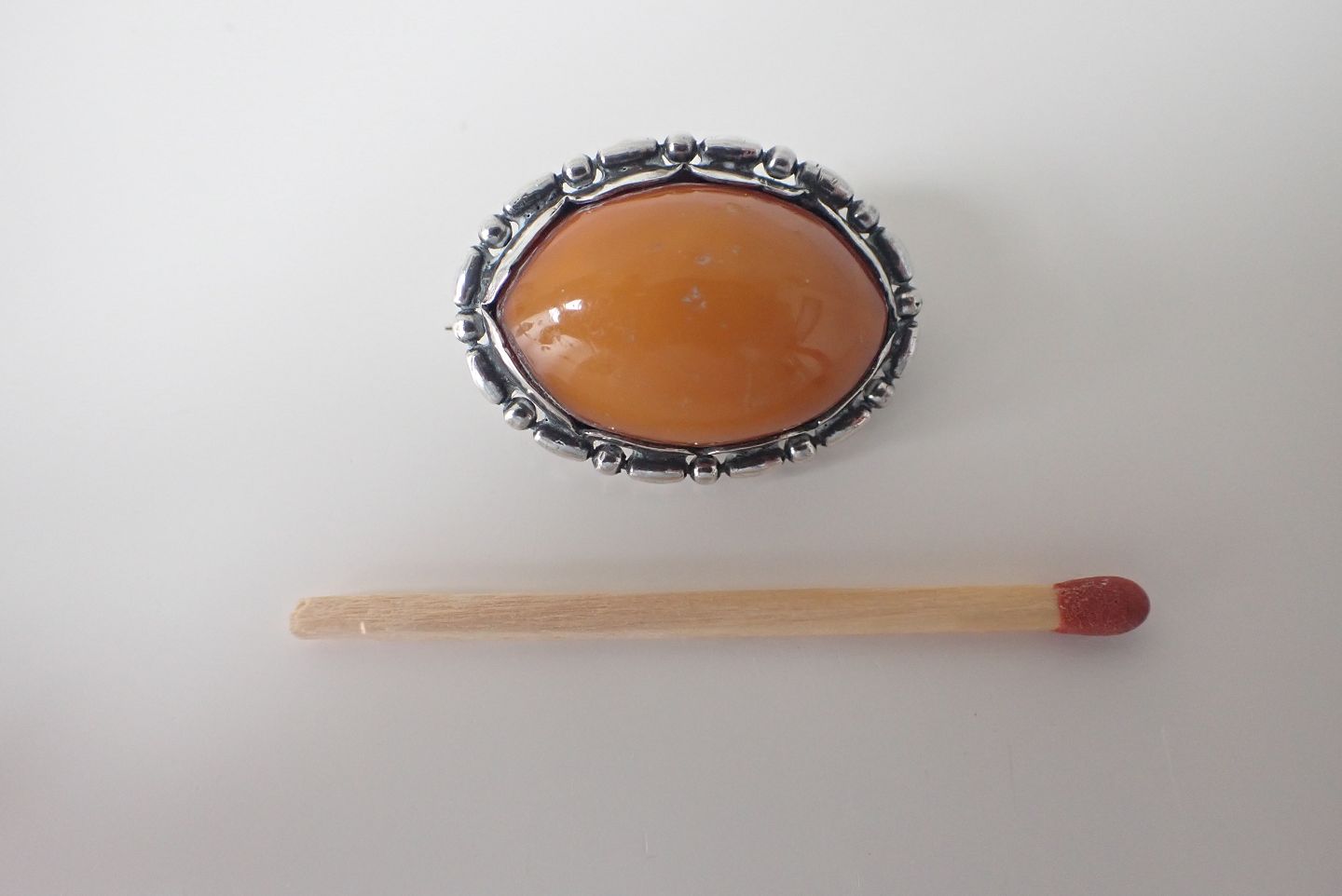 Evald Nielsen (1879 - 1958).Lille skønvirkebroche i sterling sølv med cabochonslebet mælkerav. Stemplet 880s, EN. Indgraveret på bagside 1913 - 1916. Længde: 3 cm. Bredde: 2,2 cm. I fin stand.