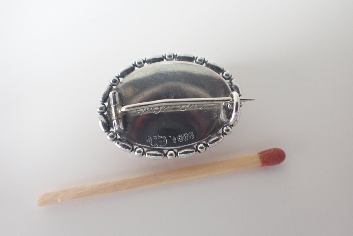 Evald Nielsen - lille skønvirke broche i sterling sølv med cabochonslebet mælkerav.