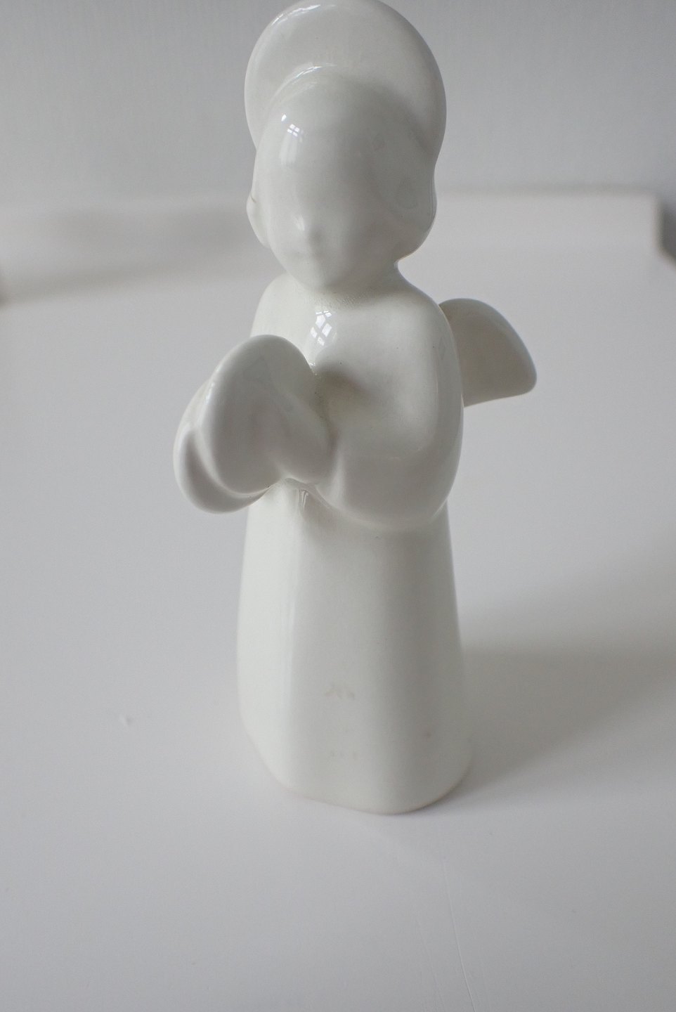 3 musikengle med bækken, fløjte og mandolin i fajance 2 fra Kgl. Porcelæn og 1 fra Aluminia. 1950 -erne. Højde: 9,5 cm. I Fin stand.